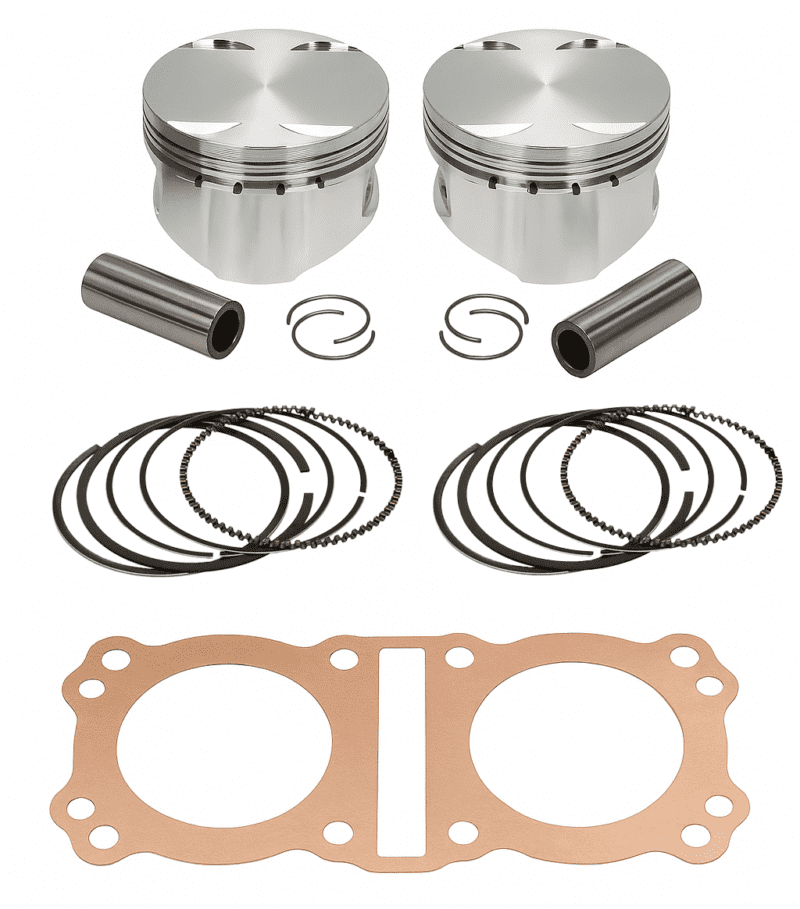 Complete kits include pistons, rings, pins, clips and a head gasket.